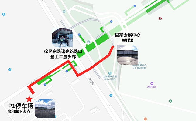 建议路线:从P1停车场(出租车西下客点)出发,步行至徐民东路诸光路路口,登上二层歩廊,沿二层歩廊向东继续步行,最终到达国家会展中心WH馆。