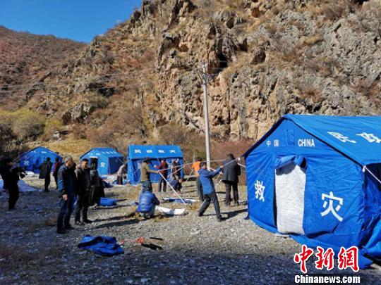 救援人员正在搭建帐篷。 刘忠俊 摄