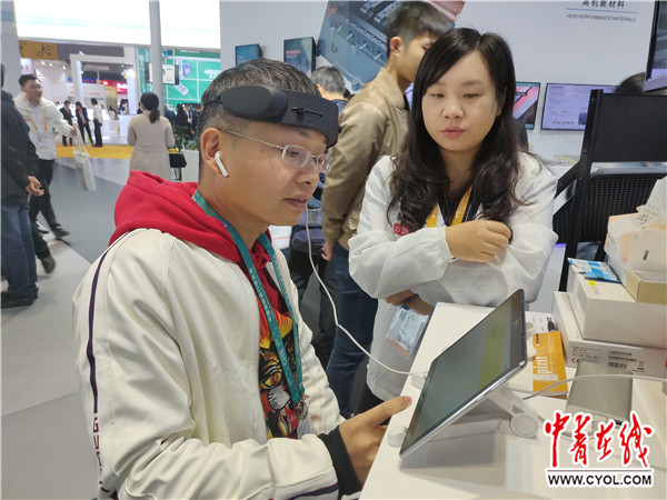 在进博会的智能及高端装备展馆,这两天有不少中老年观众来到日立展台,体验首次来到中国市场的脑功能定量成像仪。通过使用红外线光照射技术,这款头戴式半圆形仪器可以检测人类的脑部血流活动;配合智能手机app,可以实现日常的实时监测,并通过各种小游戏,对大脑进行适度负荷的锻炼。