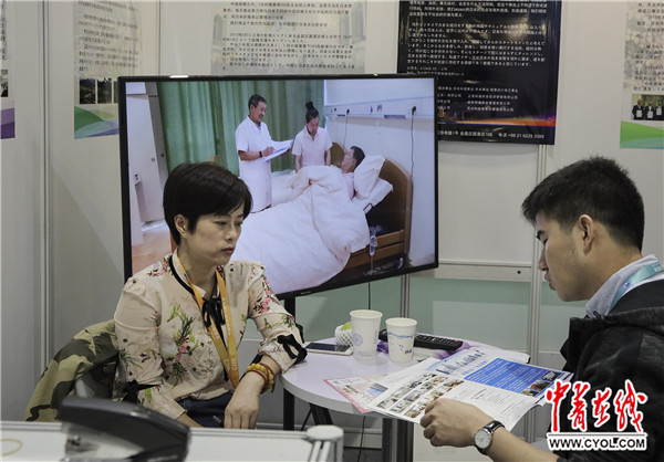 11月10日,进博会医疗器械及医药保健展区,一家日本养老投资管理公司工作人员向参观者展示该企业在中国开设的养老院资料。中国青年报·中青在线记者 李峥苨/摄