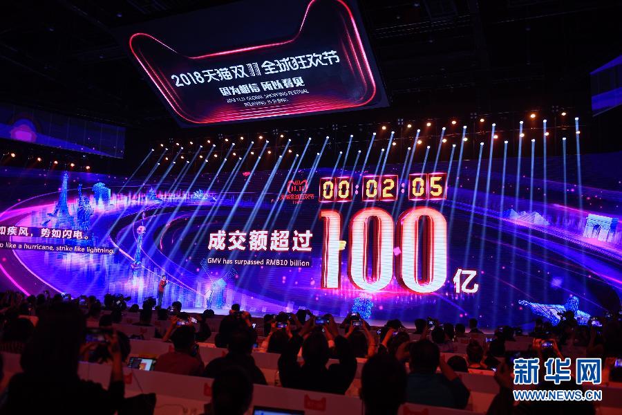 11月11日,在上海举行的“2018天猫双11全球狂欢夜”晚会上,阿里巴巴平台的大屏显示仅用了2分05秒阿里巴巴平台上的成交额冲破100亿元人民币。 11月11日的零点钟声刚过去2分05秒,2018天猫“双11”成交额已突破100亿元人民币。2017年达到这一数字的时间为3分01秒。今年是中国电商巨头阿里巴巴举办“双11”的第10个年头。 新华社记者 黄宗治 摄