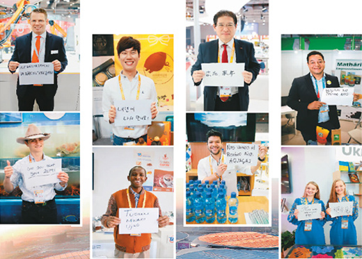 组图:11月10日,进博会上不同国家的参展人员展示用不同语言书写的“明年见”。