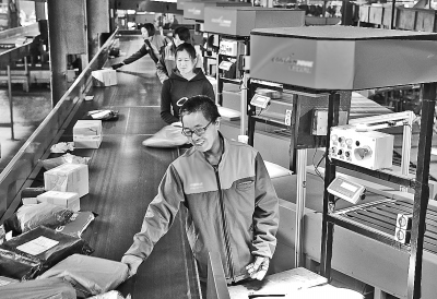 11月11日,工作人员在江苏省南通市一家快递公司分拣系统旁忙碌。国家邮政局预计,今年“双11”期间,全行业处理的邮件、快件业务量有望超过18.7亿件,最高日处理量是平日的3倍。新华社发(许丛军摄)