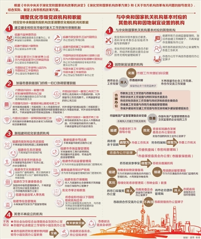 深化党和国家机构改革是推进国家治理体系和治理能力现代化的一场深刻变革。按照中央总体部署,市委、市政府高度重视机构改革工作,今年5月成立了市党政机构改革工作领导小组,组建工作专班,以高度的政治责任和使命感,稳妥推进机构改革工作。今年8月30日,十一届市委五次全会审议通过《方案》草案,报请中央批准。今年10月,党中央、国务院批准同意《方案》。根据《方案》,上海市机构改革以加强党的全面领导为统领,以国家治理体系和治理能力现代化为导向,突出城市功能特点,以推进机构职能优化协同高效为着力点,改革机构设置,优化职能配置,理顺职责关系,积极构建系统完备、科学规范、运行高效的机构职能体系。
