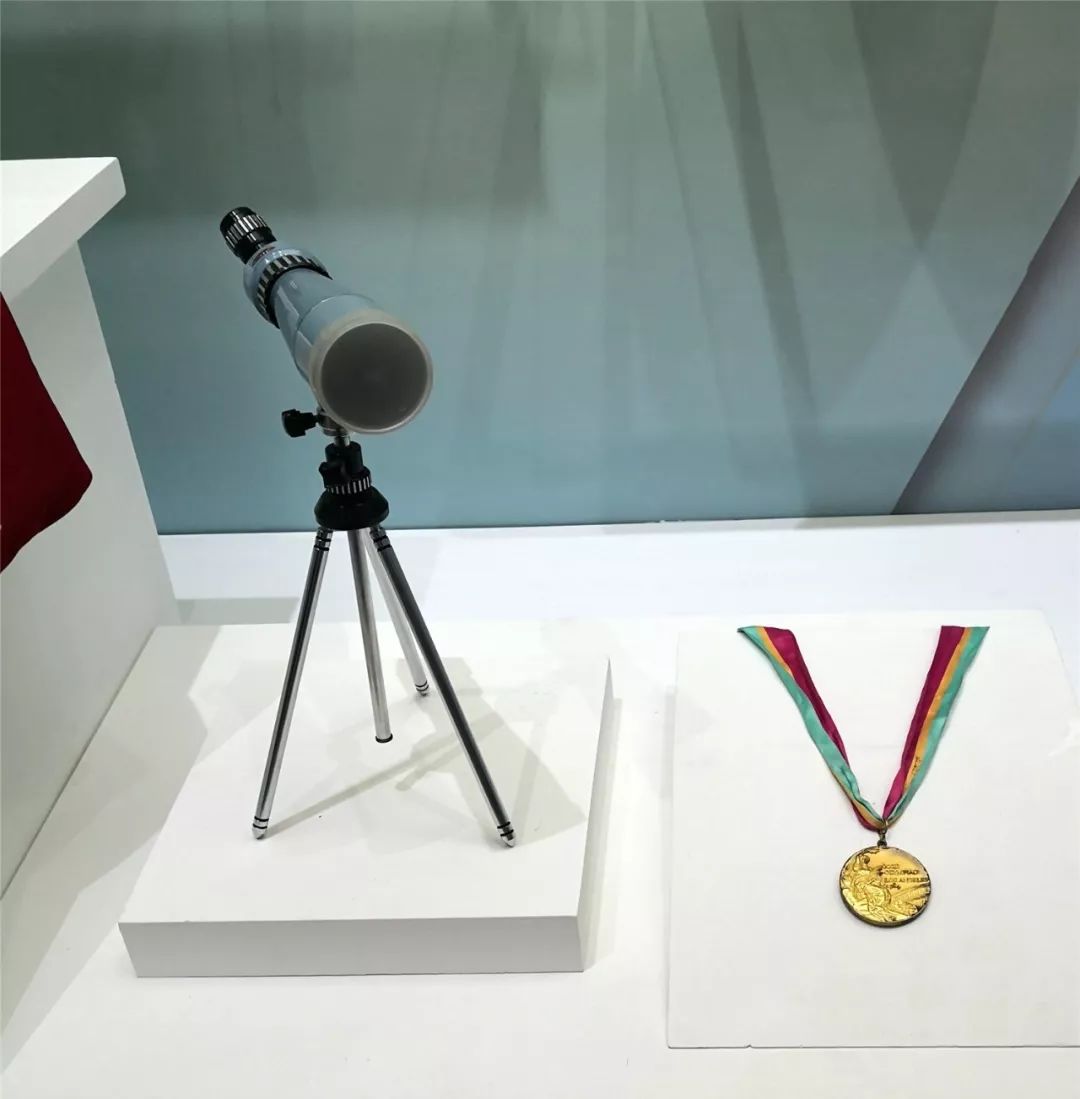 ↑著名运动员许海峰在23届奥运会射击比赛时用过的观察镜及1984年奥运会金牌。