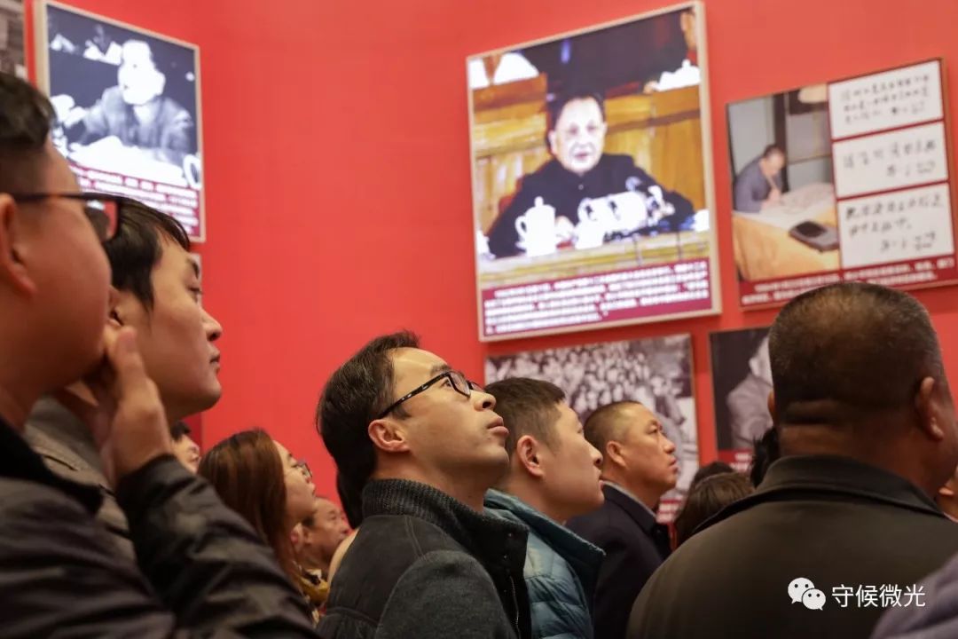展览第三展区“关键抉择——党中央推进改革开放的战略擘画”中正在认真聆听讲解的观众。