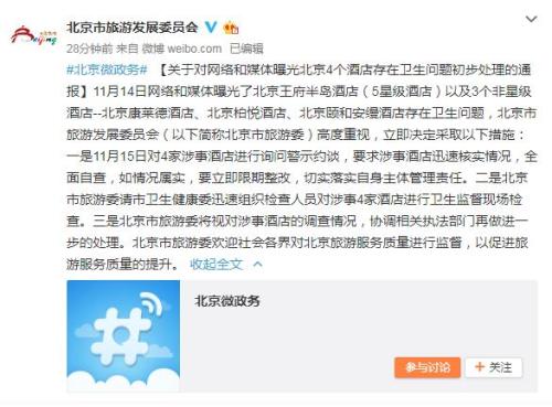 通报指出,11月14日网络和媒体曝光了北京王府半岛酒店(5星级酒店)以及3个非星级酒店--北京康莱德酒店、北京柏悦酒店、北京颐和安缦酒店存在卫生问题,北京市旅游发展委员会(以下简称北京市旅游委)高度重视,立即决定采取以下措施: