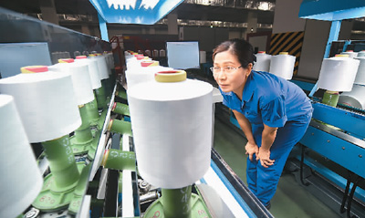 发达的民营经济、众多的特色乡镇,是江苏省苏州市吴江区鲜明特色。图为工作人员在位于苏州市吴江区的恒力集团化纤板块自动分级包装线进行外检作业。