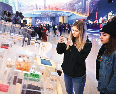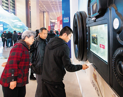 参观者在“壮美篇章”展区的媒体融合互动区体验互动项目。