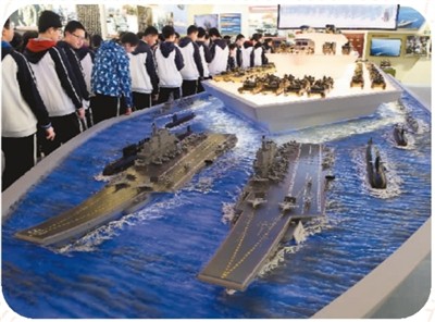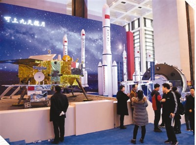 观众在展览上观看长征系列运载火箭、天宫号空间站等模型。