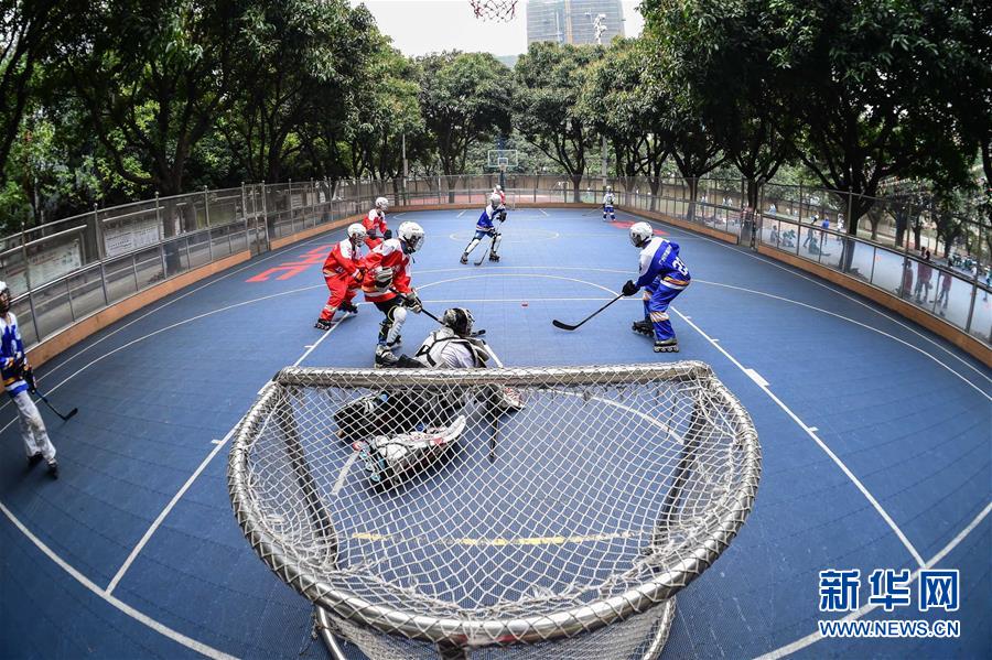 图为2017年3月16日,广州第四十一中学陆地冰球队正在校内一块带有围栏护网和专用地板的陆地冰球场训练,近年来该校建有三块轮滑场地、购置了一批陆地冰球装备。 新华社记者刘大伟摄