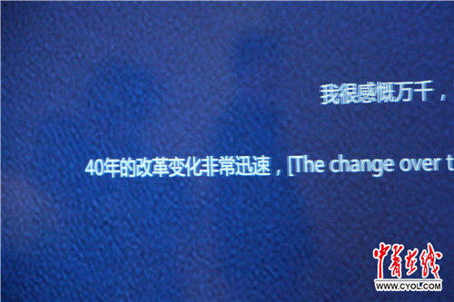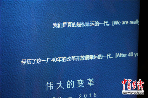 这是“伟大的变革——庆祝改革开放40周年大型展览”的观众留言区。不同于传统的手写留言,留言区采用语音识别系统,观众直接对话筒说话,系统将语音即时转换成中英文,一串串观众留言立即以“弹幕”形式在电子屏幕上滚动播出。