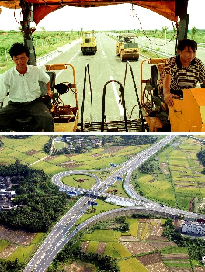 上图为1991年5月,海南省第一条高速公路在修建中;下图为已经建成的海南环岛高速公路琼海立交桥(2003年5月摄)。新华社发