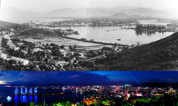 上图为1983年4月,俯瞰三亚海湾。新华社记者潘家珉摄;下图为如今的美丽三亚夜景。新华网发