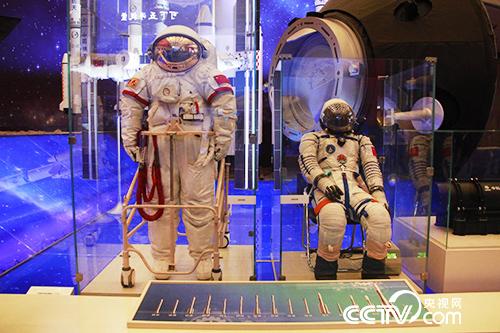 此次展览中向观众展示了出舱国旗、舱外航天服、舱内航天服、航天员手套、航天员食品包。这里陈列的是我们国家自主研制的“飞天”舱外航天服和舱内航天服。