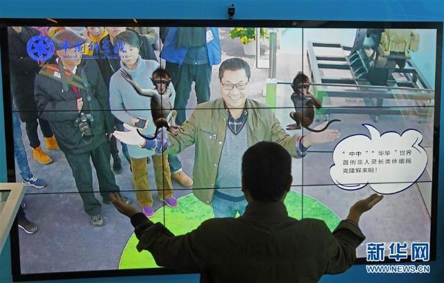 11月22日,观众通过显示屏与“克隆猴”进行拍照互动。 “伟大的变革——庆祝改革开放40周年大型展览”目前正在中国国家博物馆举行,展览上的各种科技创新展示与互动吸引众多参观者。 新华社记者 才扬 摄