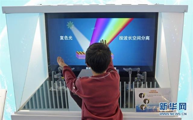 11月22日,一名小朋友与中阶梯光栅进行手势识别互动。 “伟大的变革——庆祝改革开放40周年大型展览”目前正在中国国家博物馆举行,展览上的各种科技创新展示与互动吸引众多参观者。 新华社记者 才扬 摄