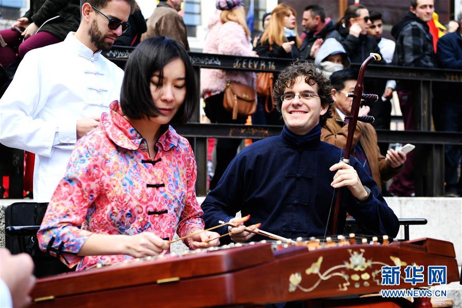 2018年2月11日,在西班牙马德里,参加弘扬中国传统文化的“快闪”艺术表演演员在索菲亚王后博物馆前演奏民乐。新华社记者 郭求达 摄
