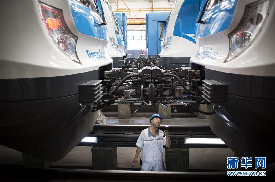 2017年4月11日,在位于阿根廷首都布宜诺斯艾利斯以南的利亚瓦略尔,中方技术人员检查为罗卡线城际铁路提供的列车。近年来,在阿根廷,中车制造的各种轨距、各种制式、各种型号的铁路机车、动车组、客车、货车和地铁列车密集交付。新华社发(马丁·萨巴拉 摄)
