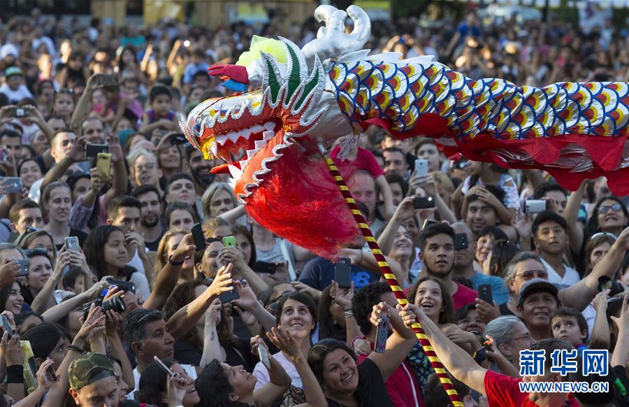 2018年2月10日,在阿根廷布宜诺斯艾利斯举行的中国春节庙会上,观众拍摄舞龙。新华社发(马丁·萨巴拉 摄)