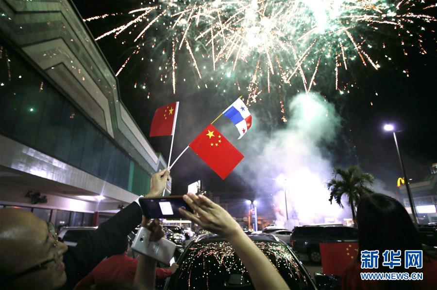 2017年6月12日,在巴拿马首都巴拿马城的华人社区,人们在巴拿马与中国建交的庆祝活动上拍摄烟花。新华社发(毛里西奥·巴伦苏埃拉 摄)