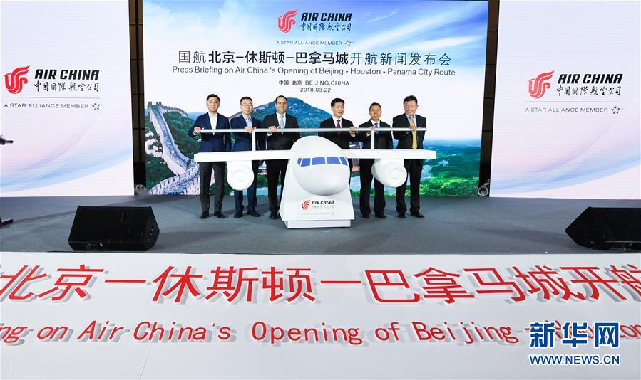 2018年3月22日,嘉宾在北京为北京—休斯顿—巴拿马城航线开通揭幕。中国国际航空公司于4月5日开通此条新航线。新华社记者 李贺 摄