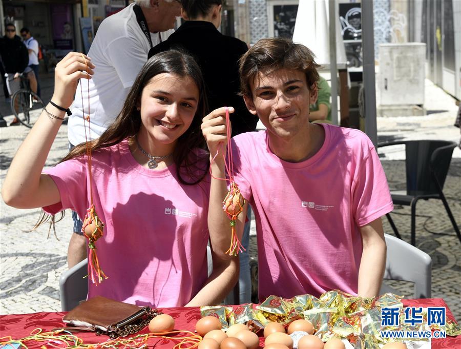 2018年6月16日,在葡萄牙阿威罗举行的端午龙舟巡游活动开幕式上,阿威罗大学孔子学院的学生展示他们制作的蛋袋。新华社记者 张立云 摄