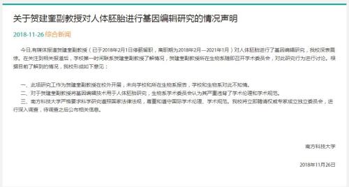 消息称,今日,有媒体报道贺建奎副教授(已于2018年2月1日停薪留职,离职期为2018年2月—2021年1月)对人体胚胎进行了基因编辑研究,南方科技大学深表震惊。