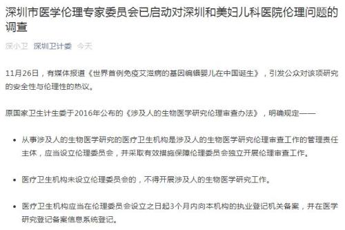 26日晚间,深圳卫计委在微信公众号发布落款为“深圳市医学伦理专家委员会”的消息称,已启动对深圳和美妇儿科医院(疑似参与项目医院)伦理问题的调查,对媒体报道的该研究项目的伦理审查书真实性进行核实,有关调查结果将及时向公众进行公布。