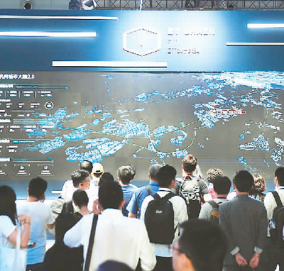 观众在2018浙江杭州·云栖大会展台观摩“杭州城市大脑2.0”平台。