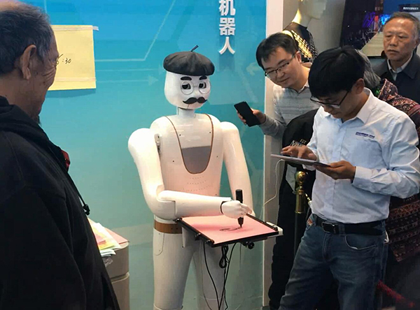 智能画像机器人“大千”在为一名观众画头像