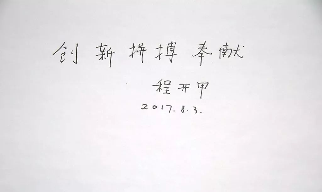 ▲程开甲院士晚年时题词:“创新、拼搏、奉献”。