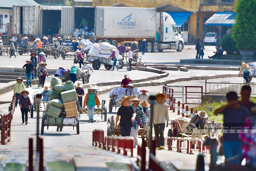 2017年,广西边境贸易进出口1469.8亿元,其中边民互市贸易进出口633.5亿元,占全国的74.4%,在全国沿边省区中排第一位。在防城港市防城区里火边民互市点,每天聚集着大量边民从事边贸,图为繁忙的里火边民互市点。记者 邓华 摄