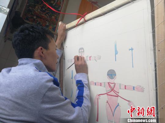 图为唐卡画师在画藏医药唐卡。资料图 赵延 摄
