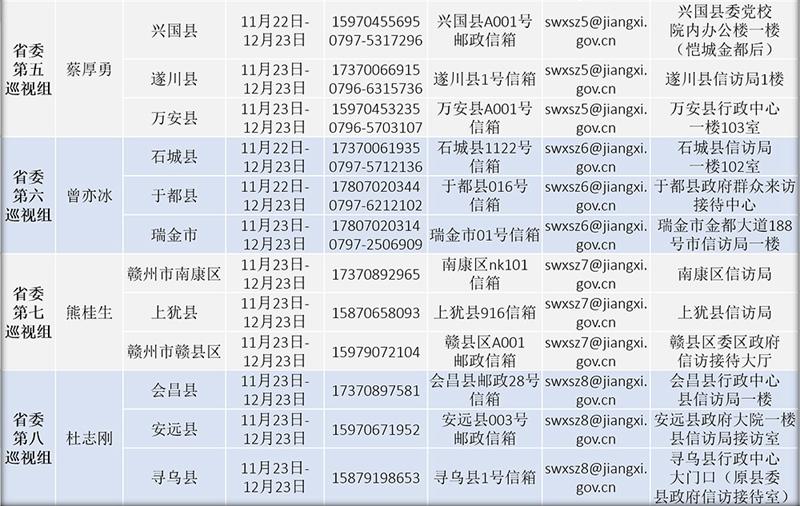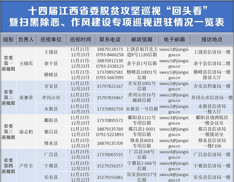 根据安排,本轮江西省委巡视时间为1个月。省委各巡视组设专门联系电话、邮政信箱、电子邮箱、举报信箱等,受理被巡视地方脱贫攻坚、扫黑除恶、作风建设方面的举报和反映。其他不属于本次专项巡视受理范围的信访问题,省委巡视组不作了解印证,只按规定交由被巡视地方或有关部门处理。