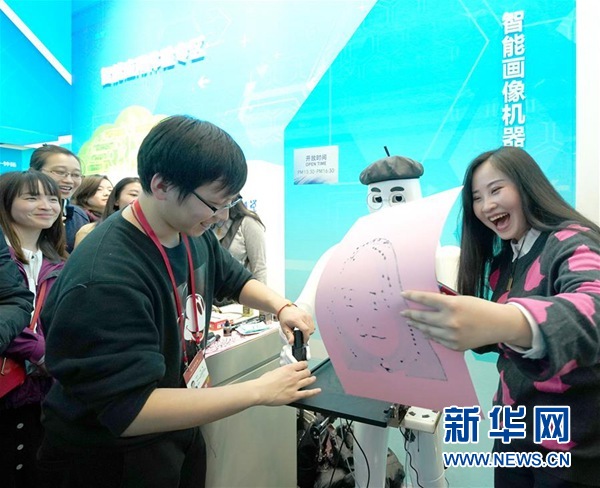 ↑11月29日,一位参观者在看到智能画像机器人为自己“创作”的画像后开怀大笑。当日,在北京国家博物馆举行的“伟大的变革——庆祝改革开放40周年大型展览”迎来参观高峰,单日观众人数超过5万人次。 新华社记者陈建力摄
