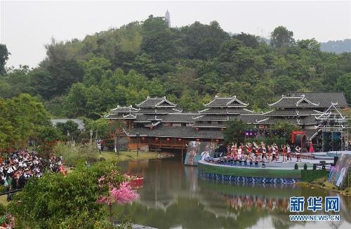 在位于南宁的广西民族村,演员在“三月三”庆祝活动上表演节目(2018年4月18日摄)。 新华社记者 陆波岸 摄