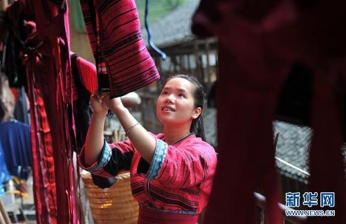 在广西龙胜各族自治县龙脊镇金坑瑶寨,一名女子在当地“晒衣节”上晾晒衣服(2014年7月2日摄)。新华社记者 陆波岸 摄