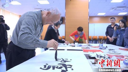 图为市民驿站里的老人在写书法。 康玉湛 摄