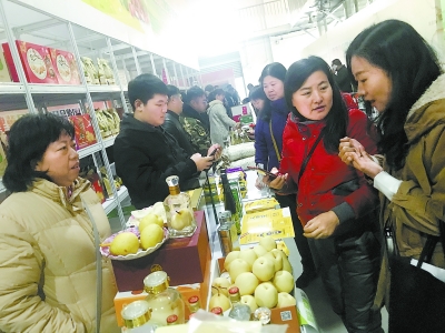 在金果梨展台,工作人员切开黄澄澄的梨果,招呼客人们品尝:“您看这是金果梨,果大脆甜,每颗都有一斤多,果糖含量高,生吃脆甜多汁,冬天炖上一碗梨汤清甜润肺正是时候呢!”这些金果梨来自天津市石各庄镇,是当地的金字招牌“扶贫果”。