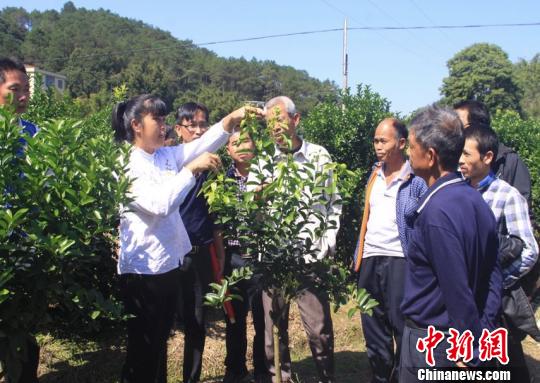 图为农业技术人员为贫困户现场培训砂糖橘种植技术。 吴春凤 摄