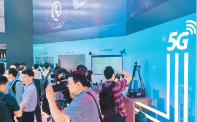 8月31日,在第十四届中国(南京)国际软件产品和信息服务交易博览会上,参观者参观体验5G展区。苏 阳摄(人民视觉)