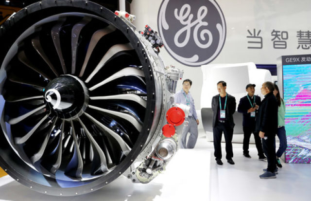 参观者在上海举办的首届进博会智能及高端装备展区观看展出的飞机发动机模型(11月5日摄)。新华社记者 方喆 摄