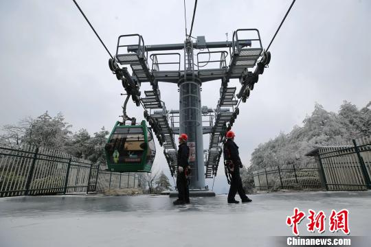 黄石寨索道检修工在冰雪天气对索道进行巡检。 吴勇兵 摄