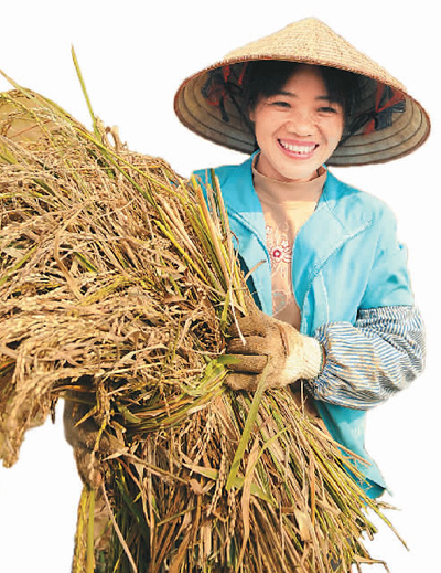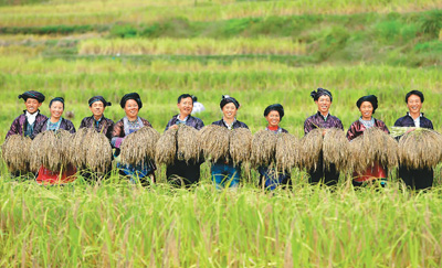 在广西融水苗族自治县良寨乡大里村,村民们展示刚刚收割的紫黑香糯。