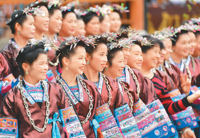 在广西融水苗族自治县洞头镇洞头村,身穿侗族服饰的侗族妇女在寨门口迎宾。