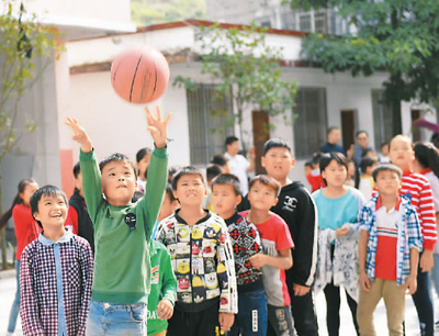 在广西都安瑶族自治县下坳镇隆麻小学,学生在课间打篮球。