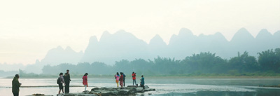 游客在广西桂林市阳朔县兴坪镇漓江边上游玩。