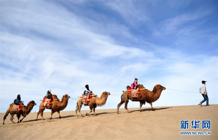 游客在敦煌鸣沙山骑骆驼(2017年5月3日摄)。新华社记者 陈斌 摄