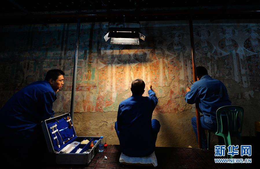 技术人员在莫高窟内对病害壁画进行修复(2014年9月3日摄)。新华社记者 陈斌 摄